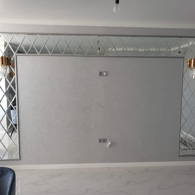 Использовалась серебристая зеркальная плитка формы "вытянутый ромб".
