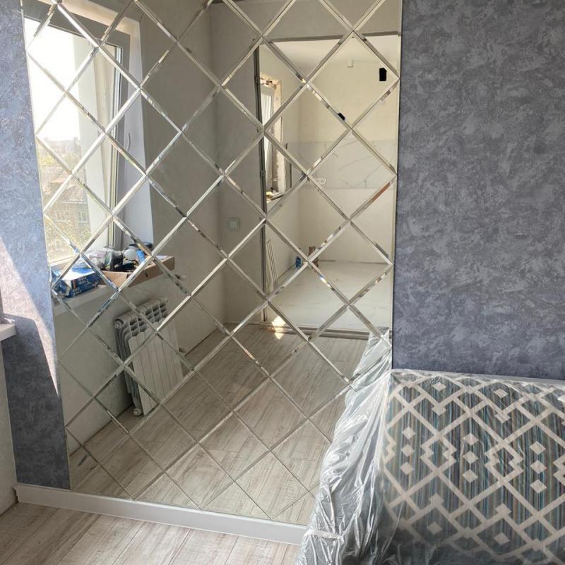 Использована серебристая квадратная зеркальная плитка размером 18х18.